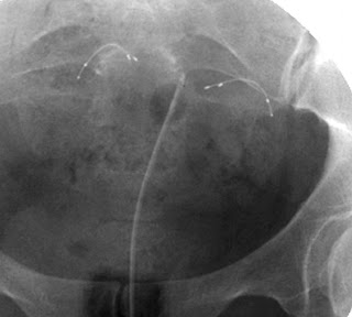 a. Irreversible tubal occlusion with a microinsert. (a) Scout radiograph obtained prior to the instillation of contrast material shows a microinsert that has been placed hysteroscopically into the proximal fallopian tube. (b) Radiograph obtained after instillation shows no contrast material filling of the fallopian tube beyond the microinsert, a finding that helps document tubal occlusion.